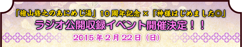 「神様はじめました◎」と音泉の長寿番組「檜山修之のあにめじ湯」がアニメ1期に引き続き2期でもコラボイベントを実施します!1/21発売の神様はじめました◎キャラクターソングをお買い上げの方を抽選でご招待しちゃいます!!